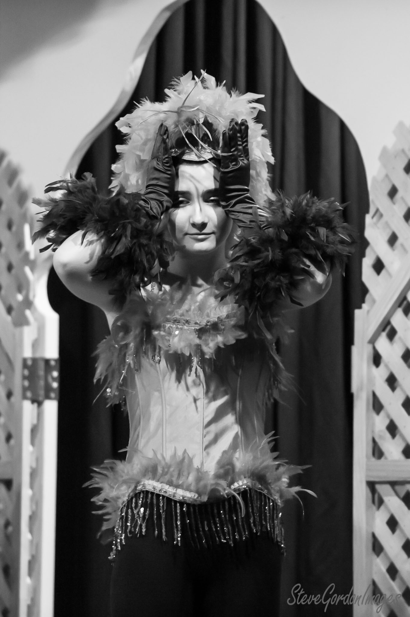 GalleriesArtsTheatre13 AladinRehearsalsFeathered, Gloved, Corseted, Black And White. A performer, in costume, poses on stage. She wears feathers, gloves, and a beaded corset. The show begins. Feathered, Gloved, Corseted, Black And White.