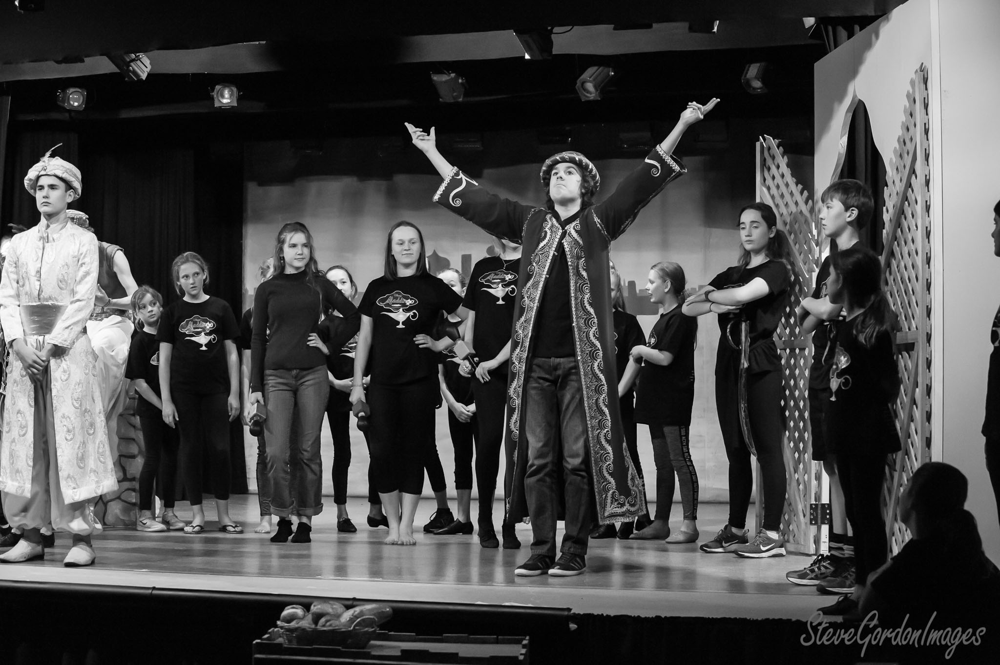 GalleriesArtsTheatre13 AladinRehearsalsAladdin Play, Stage, Black And White A stage production of Aladdin. The main actor, in costume, gestures with arms raised. Other actors stand behind him. Aladdin Play, Stage, Black And White