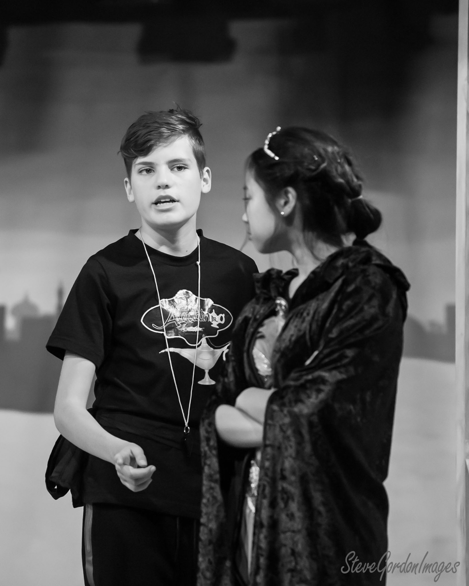 GalleriesArtsTheatre13 AladinRehearsalsDrama Play, Black And White. Two actors perform a scene from "Aladdin Jr." The boy gestures, the girl, in a crown, listens. Drama Play, Black And White.