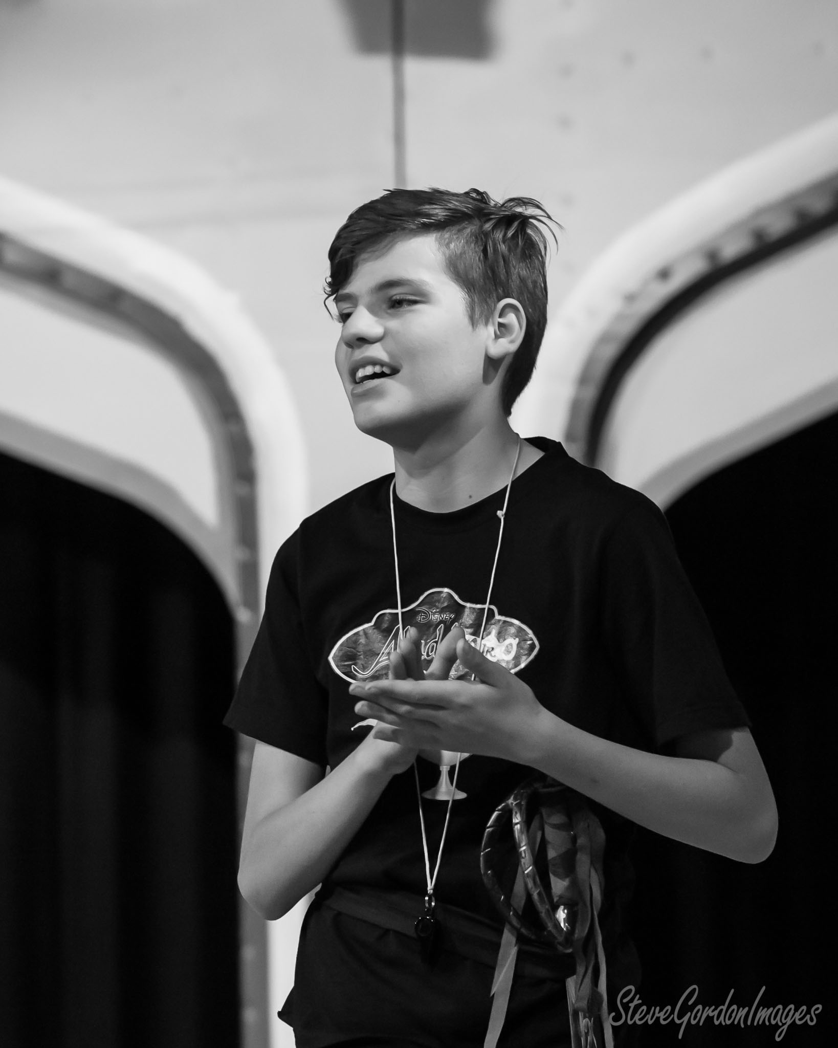GalleriesArtsTheatre13 AladinRehearsalsBoy Clapping, Stage, Black And White. A young man, wearing a Disney shirt, claps on stage. He has a whistle and lanyard. Boy Clapping, Stage, Black And White.