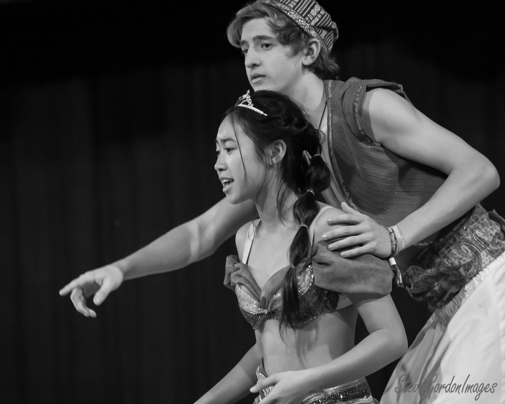 GalleriesArtsTheatre13 AladinRehearsalsStage Play: Princess And Prince. A stage performance of Aladdin. Jasmine, with a tiara, is guided by Aladdin, pointing. They are in costume. Stage Play: Princess And Prince.