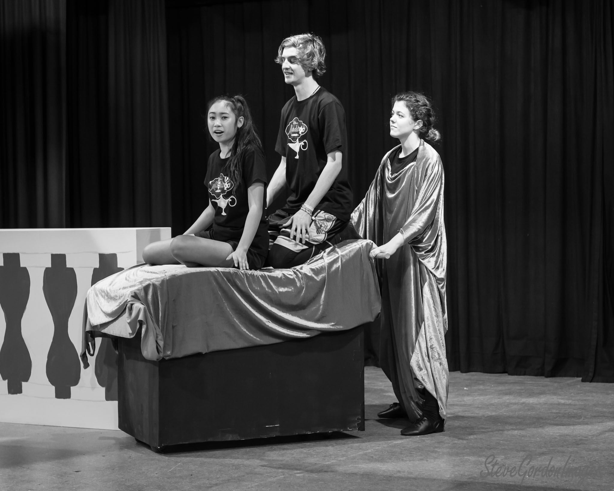 GalleriesArtsTheatre13 AladinRehearsalsStage Play, Black And White. Three actors perform a scene from "Aladdin" on stage. The actors wear Aladdin t-shirts. A prop bed is used. Stage Play, Black And White.