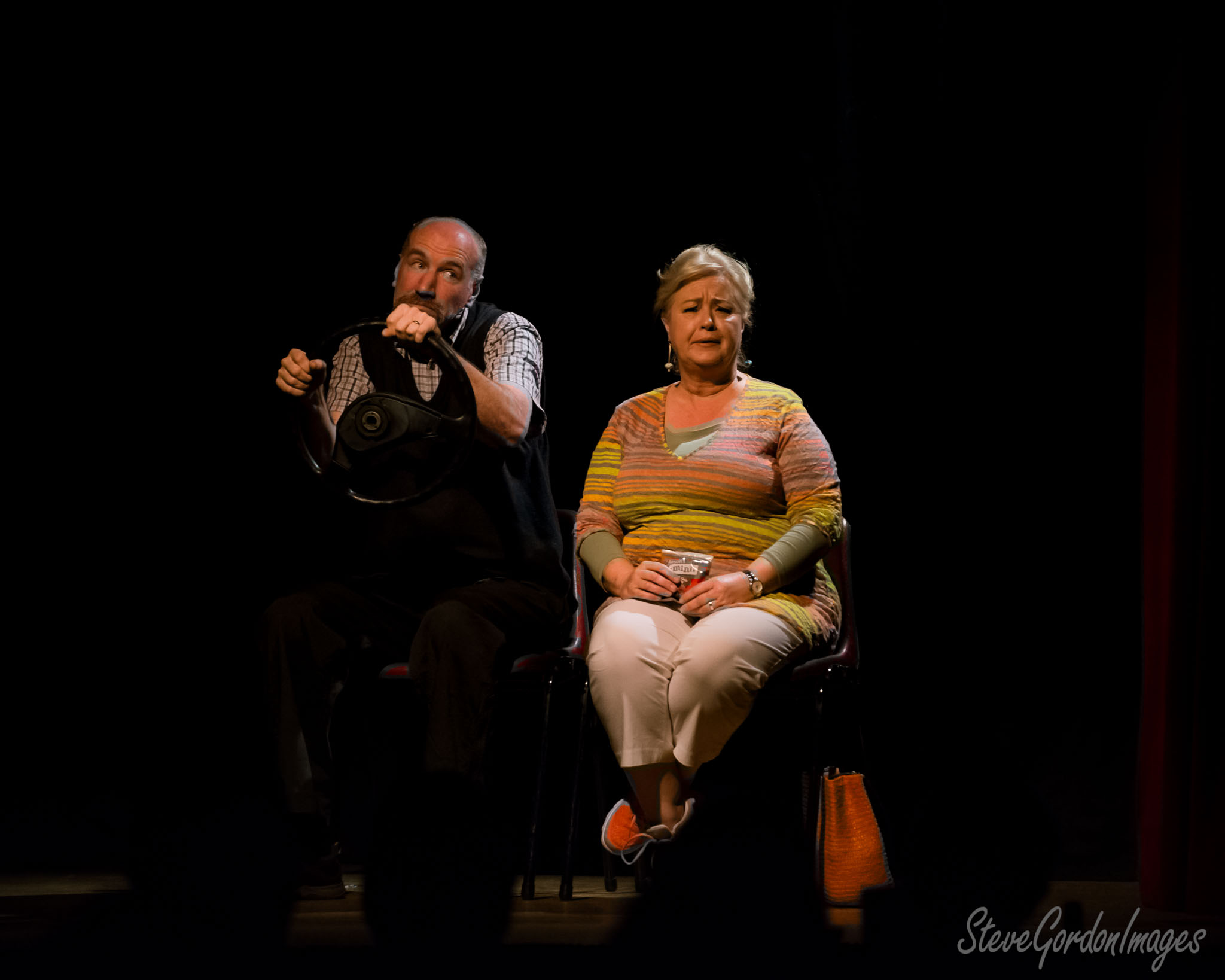 GalleriesArtsTheatre14 Take TwoTake Two PerformancesDriving lessons gone wrong maybe? A man, with a steering wheel, and a woman, with a "mini" snack, sit on stage. They are acting. Driving lessons gone wrong maybe?