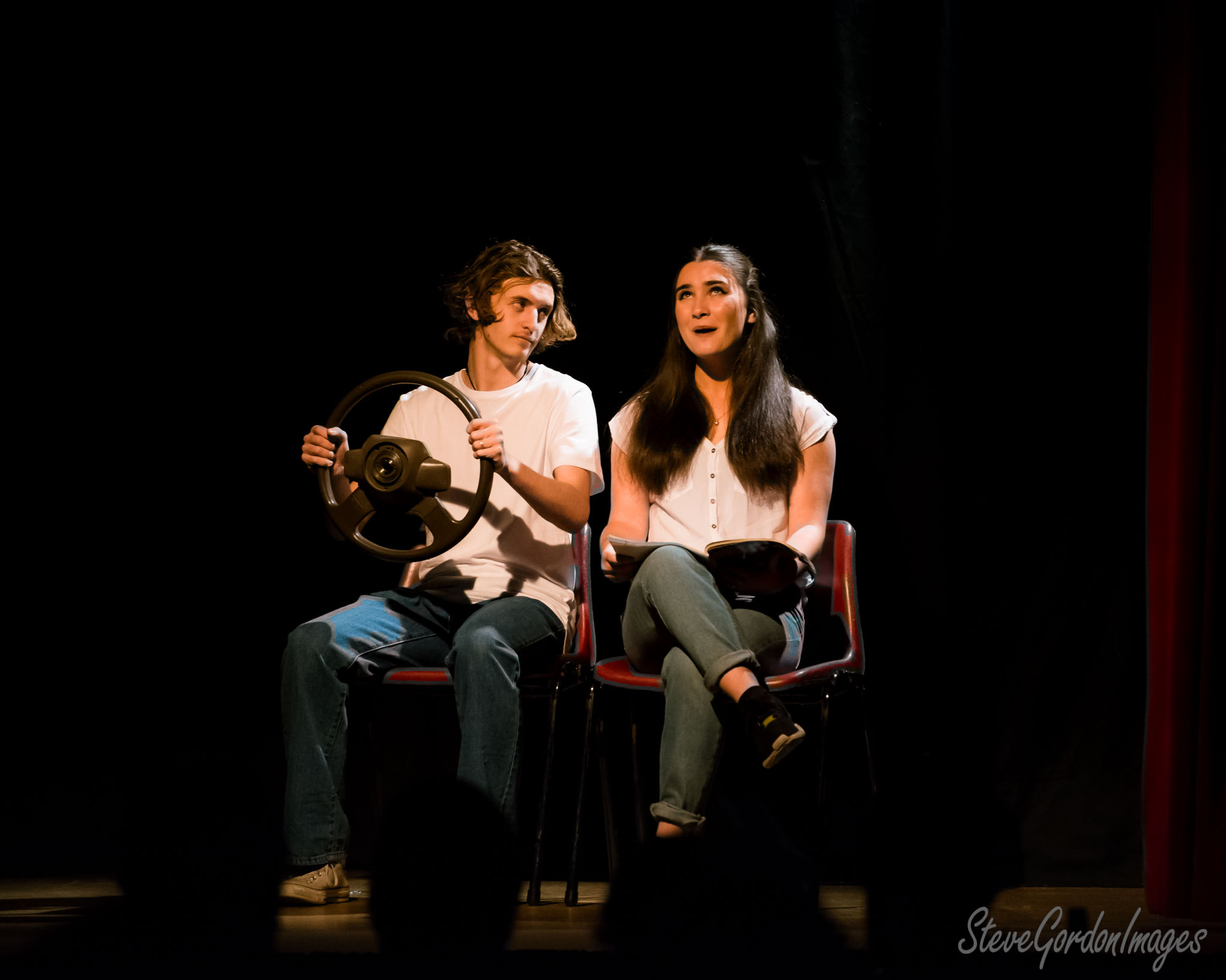 GalleriesArtsTheatre14 Take TwoTake Two PerformancesSteering wheel and open mouth drama Two actors perform a scene. One holds a steering wheel, the other reads from a book, on stage. Steering wheel and open mouth drama