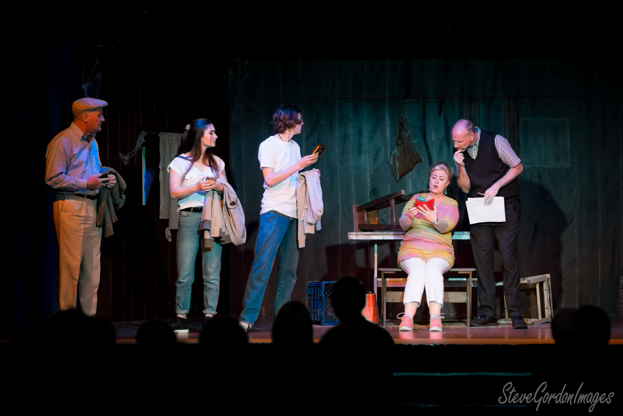 GalleriesArtsTheatre14 Take TwoTake Two PerformancesStage drama phone frenzy chaos. Actors perform a play. The woman on the bench holds a red book. Others hold phones, papers, and coats. Stage drama phone frenzy chaos.