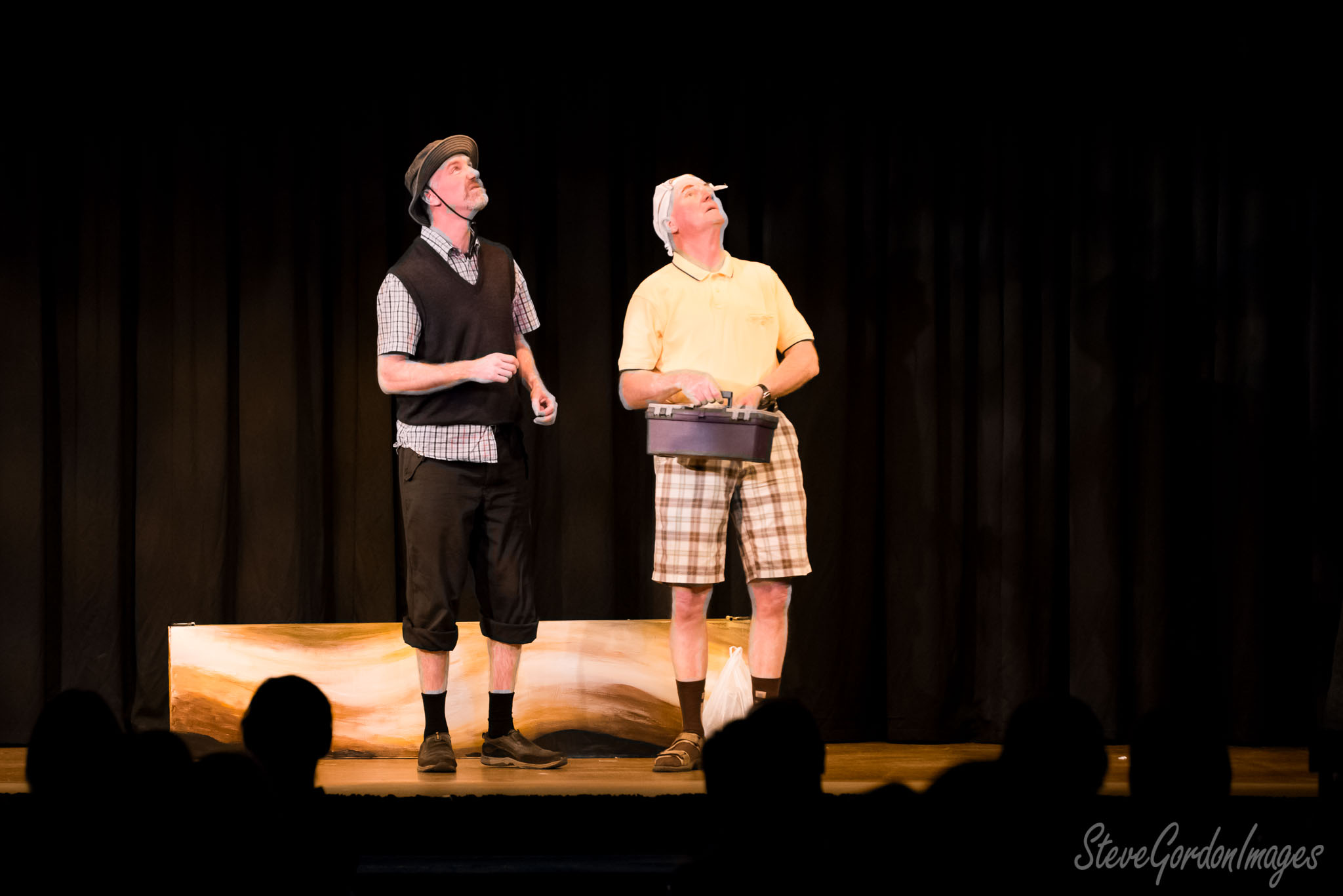 GalleriesArtsTheatre14 Take TwoTake Two PerformancesUpward gaze of the actors. Two men on stage, looking up. One holds a toolbox. They perform for an audience. Upward gaze of the actors.