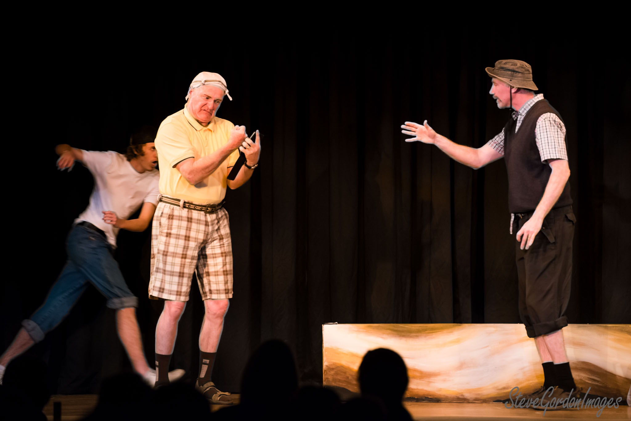 GalleriesArtsTheatre14 Take TwoTake Two PerformancesStage chaos plaid shorts drama On stage, three actors perform a play. The man in plaid shorts holds a phone, reacting to the other man. Stage chaos plaid shorts drama