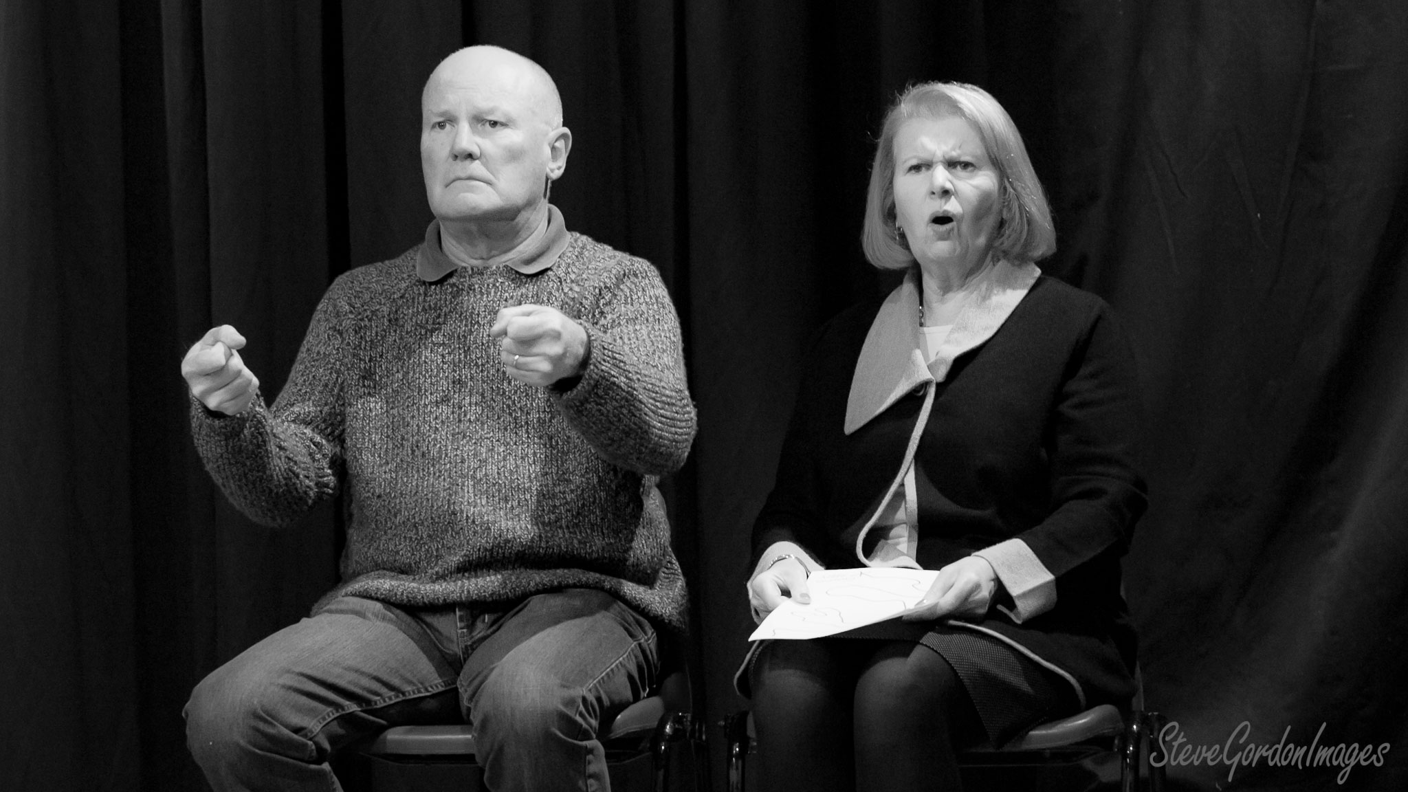 GalleriesArtsTheatre14 Take TwoRehearsalsActors On Stage, Black And White Two people sit, the man gestures, the woman holds paper, both appear to be reacting to something. Actors On Stage, Black And White