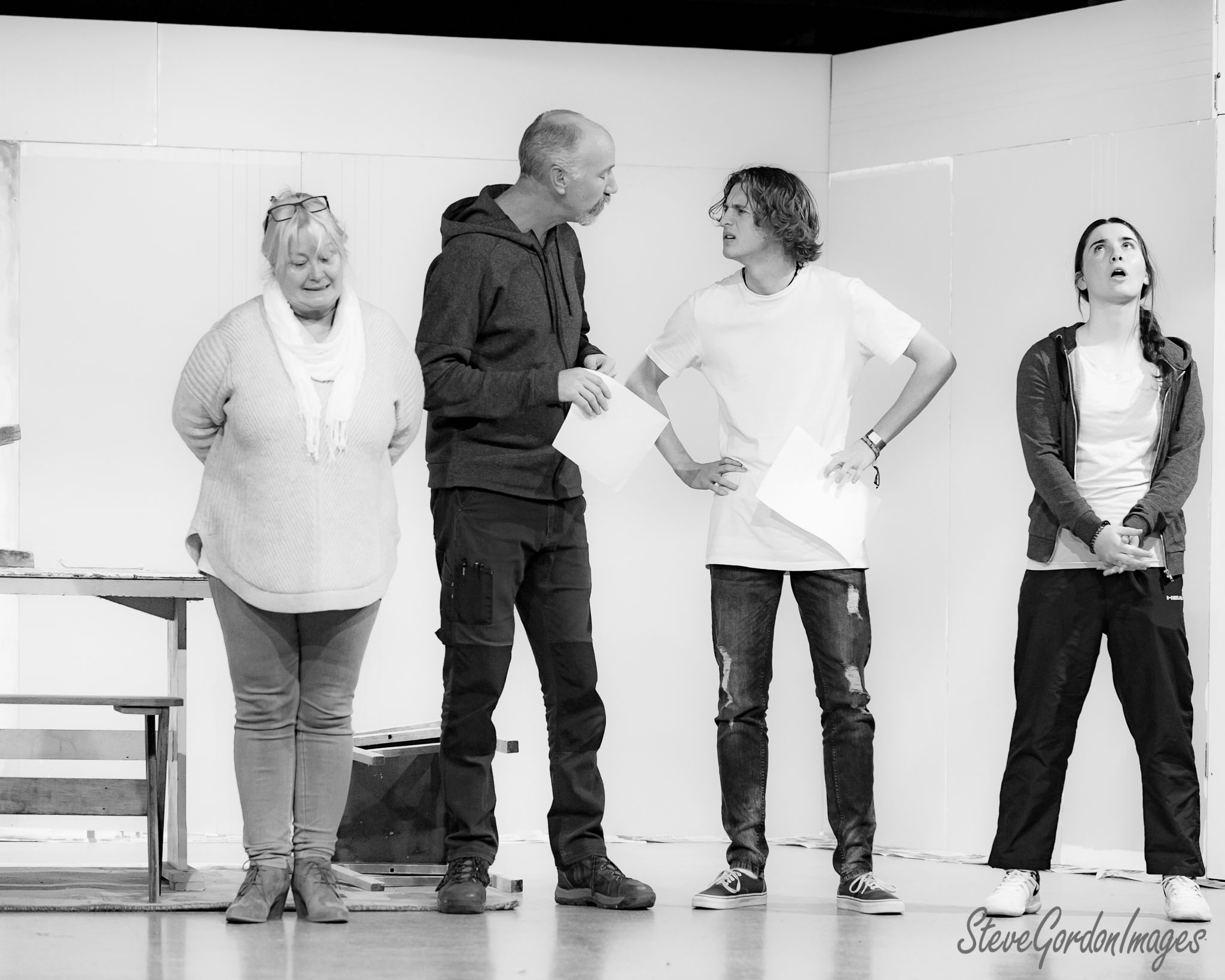 GalleriesArtsTheatre14 Take TwoRehearsalsActors Rehearsing On A Stage. Four actors rehearse a play, each holding scripts, with varied expressions, on a stage. Actors Rehearsing On A Stage.