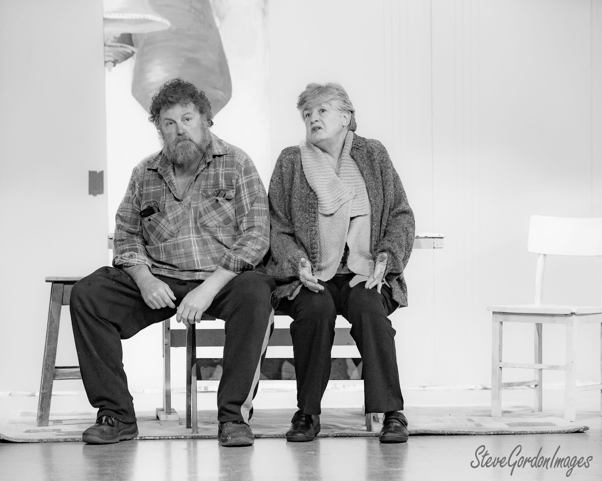 GalleriesArtsTheatre14 Take TwoRehearsalsWaiting, On Stage, Black And White. Two actors sit on a bench, rehearsing a scene. The man wears a plaid shirt. The woman wears a scarf. Waiting, On Stage, Black And White.
