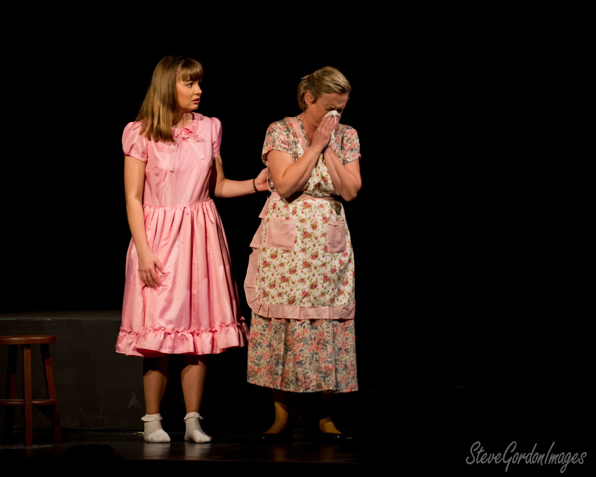 Two women on stage. One in pink comforts the other, who cries into a tissue, wearing a floral apron.