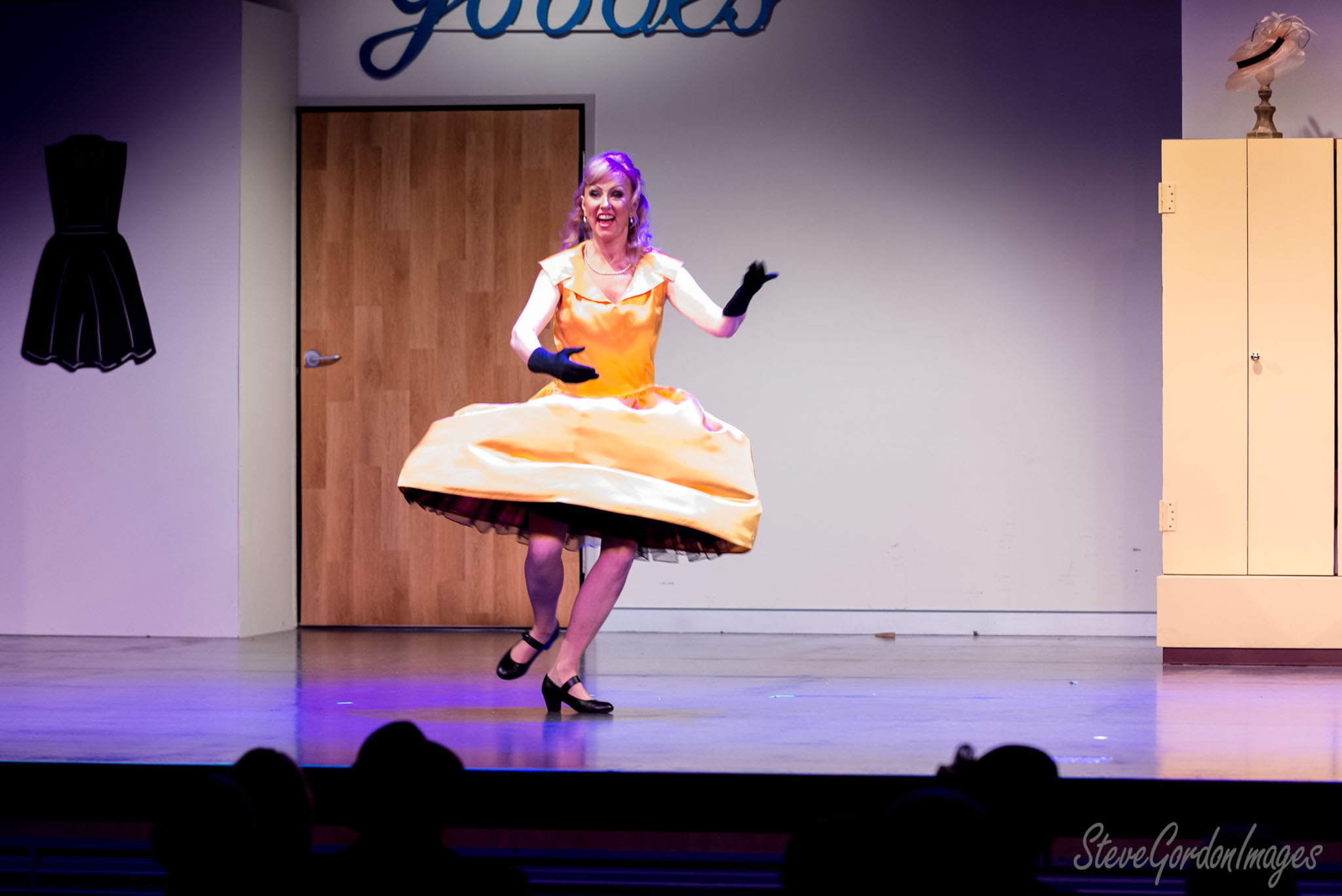 GalleriesArtsTheatre15 Ladies In BlackPerformancesDancing Lady In Yellow Dress. A woman in a yellow dress dances on stage, performing for an audience. The word "goods" is above. Dancing Lady In Yellow Dress.