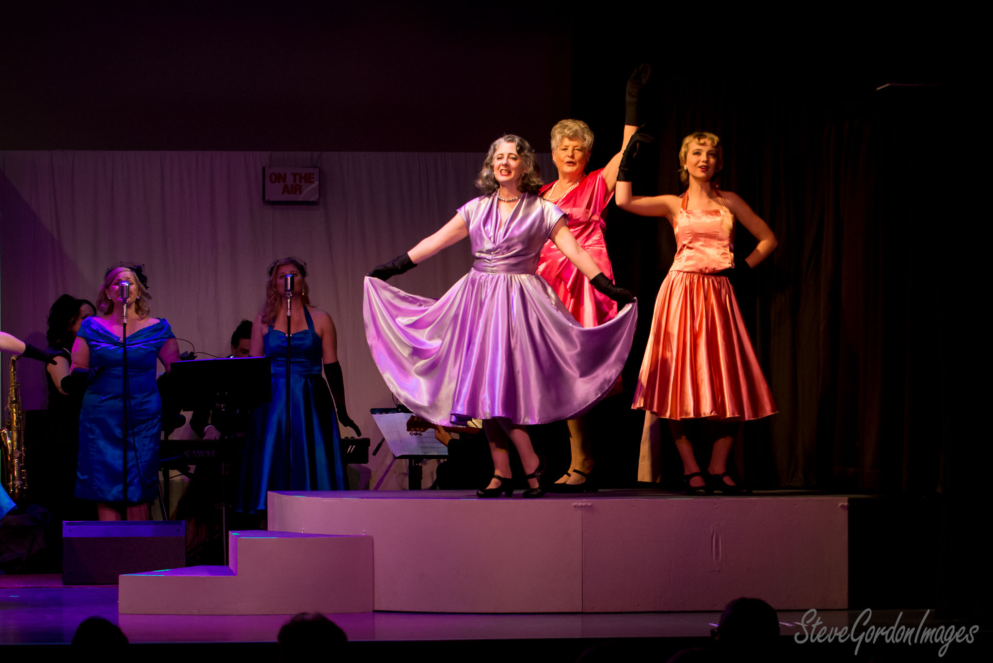 GalleriesArtsTheatre15 Ladies In BlackPerformancesVintage Singers On Stage Performing. Three women in dresses perform on stage, "ON THE AIR" sign visible. Musicians play behind them. Vintage Singers On Stage Performing.