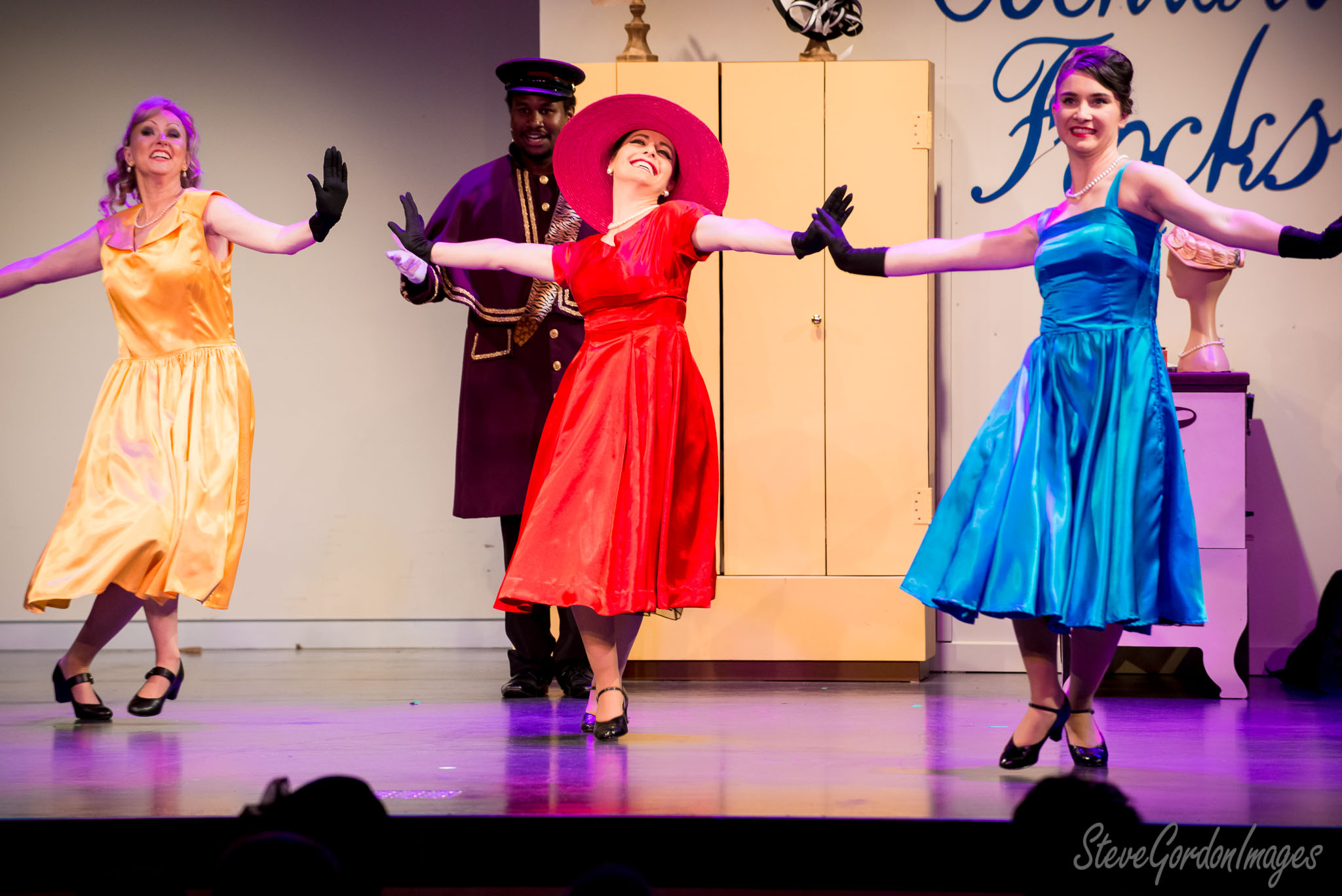 GalleriesArtsTheatre15 Ladies In BlackPerformancesStage Performers In Colorful Dresses. Three performers dance on stage, one in red, one in blue, and one in yellow. A man in purple stands behind. Stage Performers In Colorful Dresses.