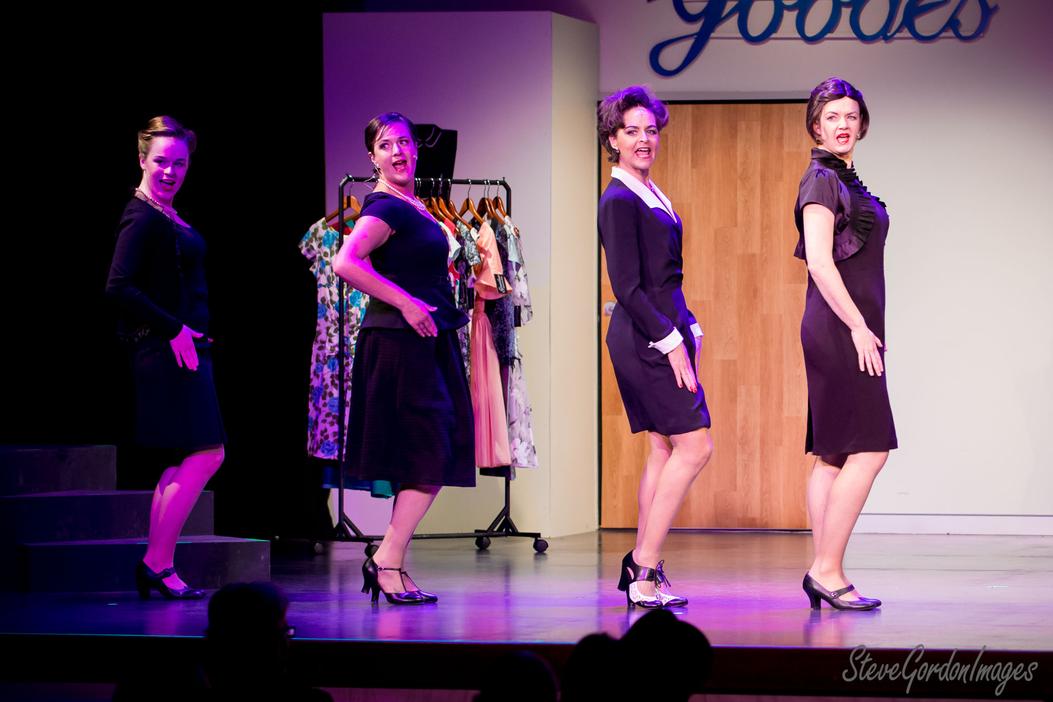 GalleriesArtsTheatre15 Ladies In BlackPerformancesStage Performers In Vintage Dresses. Four women perform on stage, dressed in black, in front of a "Goodies" sign. They are acting. Stage Performers In Vintage Dresses.