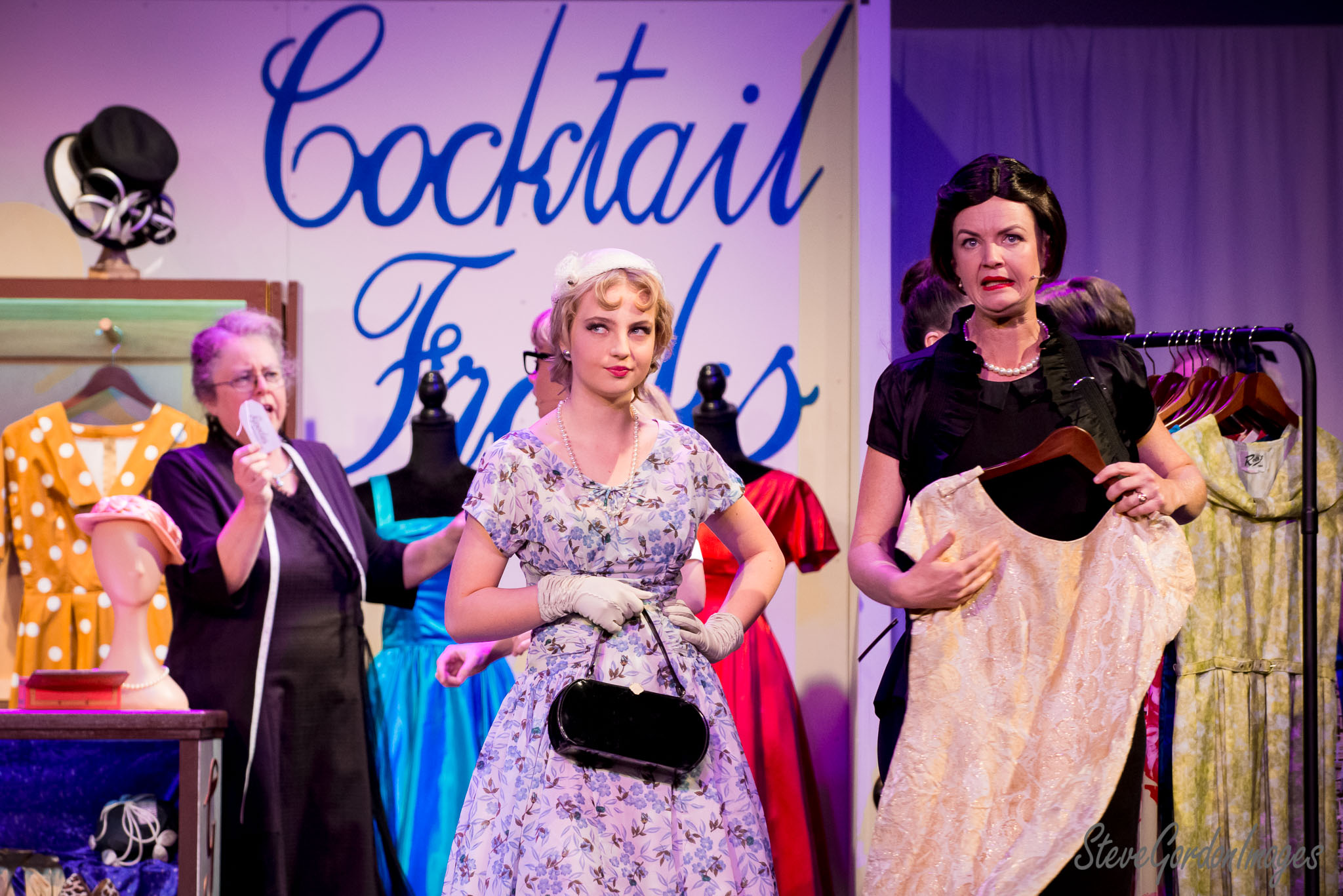 GalleriesArtsTheatre15 Ladies In BlackPerformancesVintage Fashion Show, Stage Drama. A play titled "Cocktail Frocks" features women in vintage dresses, one holding a dress, another with a purse. Vintage Fashion Show, Stage Drama.