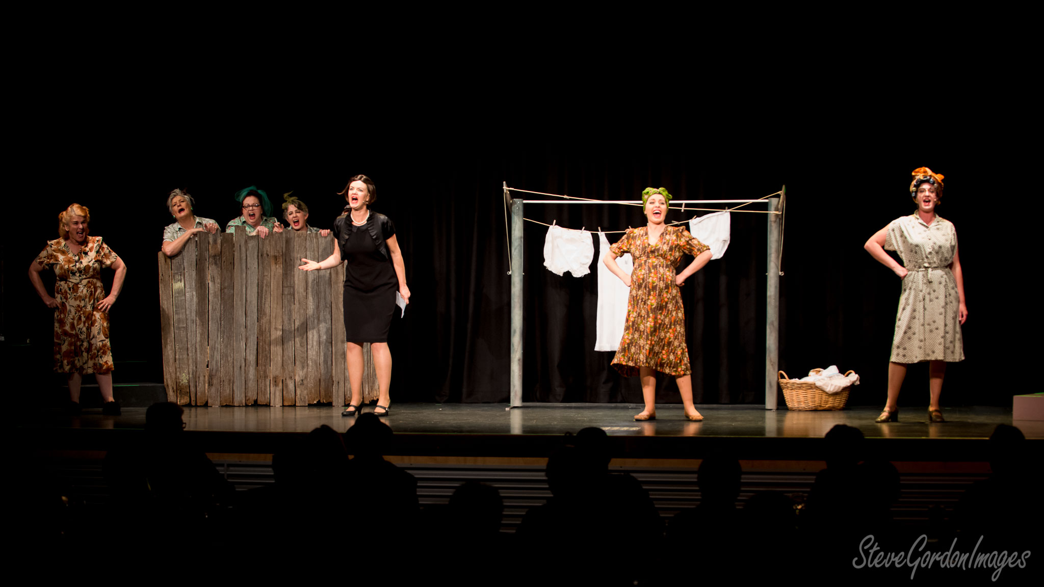 GalleriesArtsTheatre15 Ladies In BlackPerformancesStage Play, Women, Costumes, Expressions, Drama A play unfolds: Women in vintage dresses act on stage, a fence, clothesline, and audience present. Stage Play, Women, Costumes, Expressions, Drama