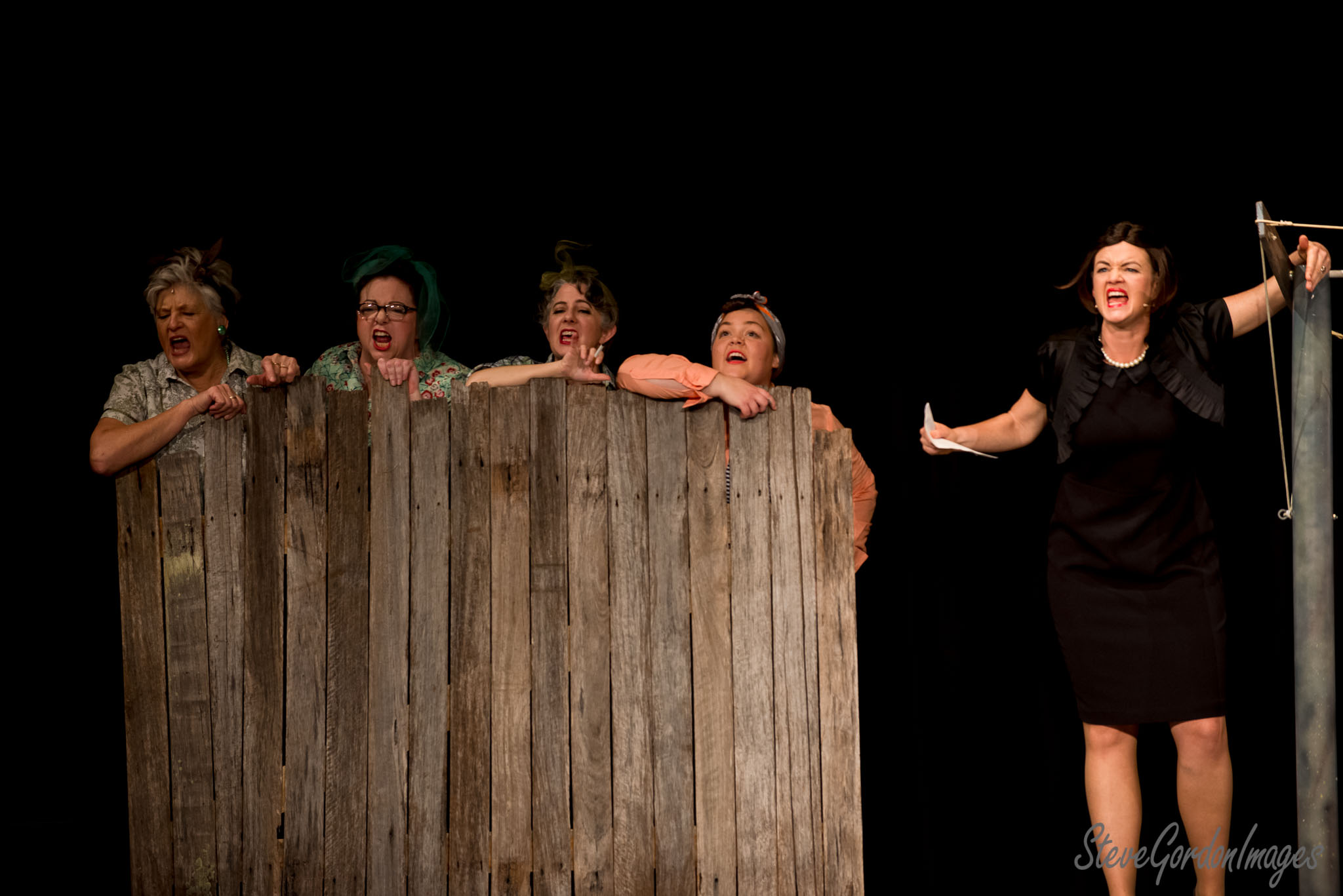 GalleriesArtsTheatre15 Ladies In BlackPerformancesWomen Screaming Behind Wooden Fence Five women on stage, behind a wooden fence, react to a woman in black holding a paper. Women Screaming Behind Wooden Fence