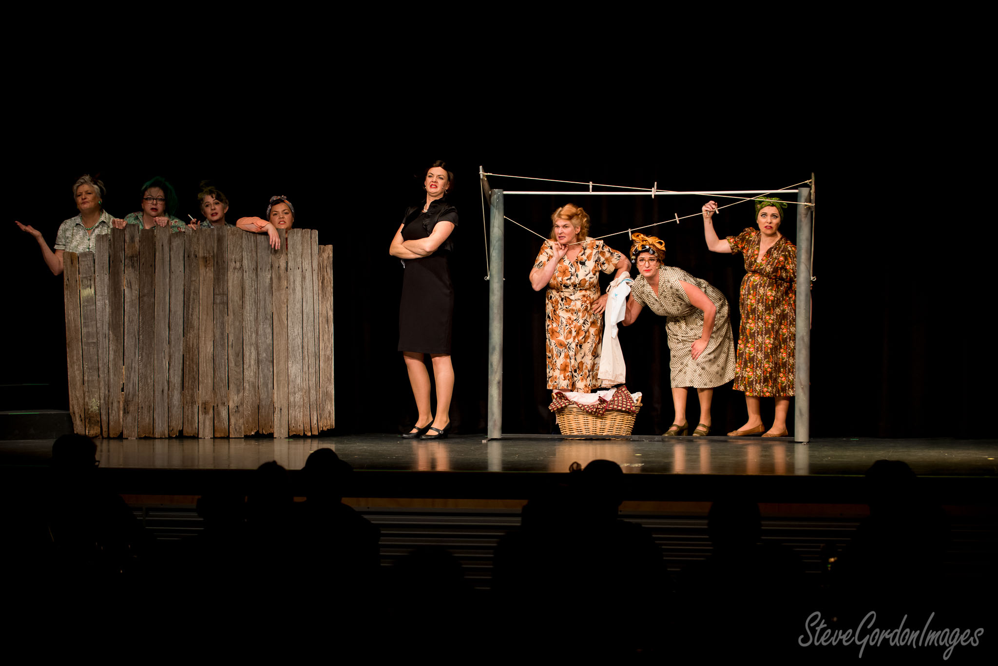 GalleriesArtsTheatre15 Ladies In BlackPerformancesStage Play, Women, Fence, Laundry, Drama. A play: Women gossip over a fence, while others hang laundry. One woman in black looks on. Stage Play, Women, Fence, Laundry, Drama.