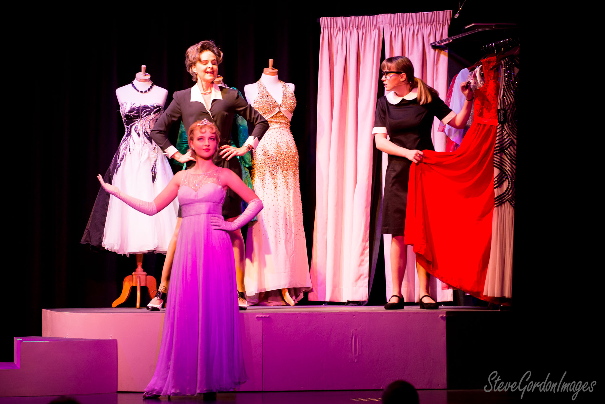 GalleriesArtsTheatre15 Ladies In BlackPerformancesStage, Dresses, Women, Drama, Performance. A stage production: A woman in a pink dress, a woman in black, and dresses on mannequins. Stage, Dresses, Women, Drama, Performance.