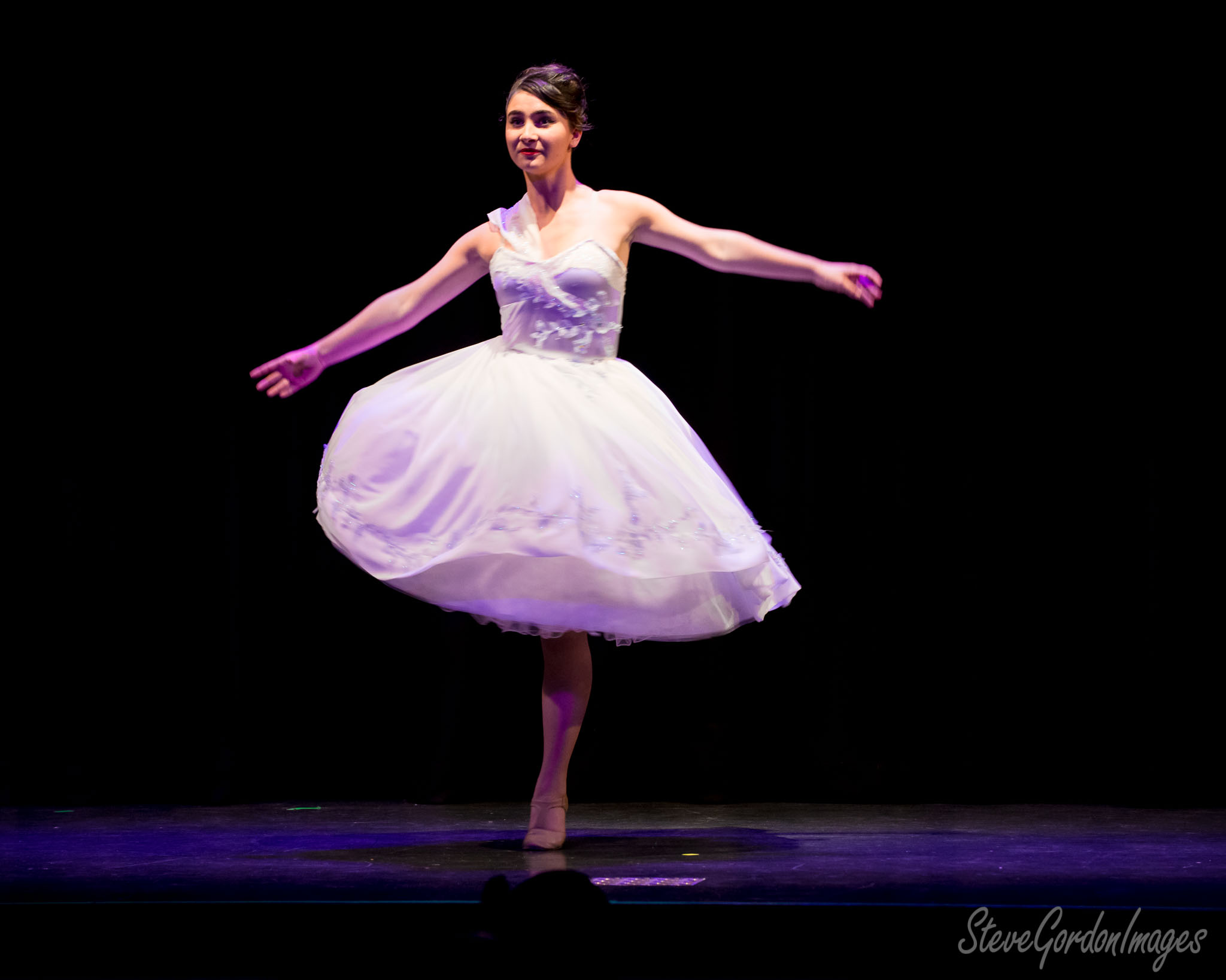 GalleriesArtsTheatre15 Ladies In BlackPerformancesGraceful Ballerina In White Dress. A ballerina, in a white dress, performs a graceful dance on stage, arms outstretched, one leg raised. Graceful Ballerina In White Dress.