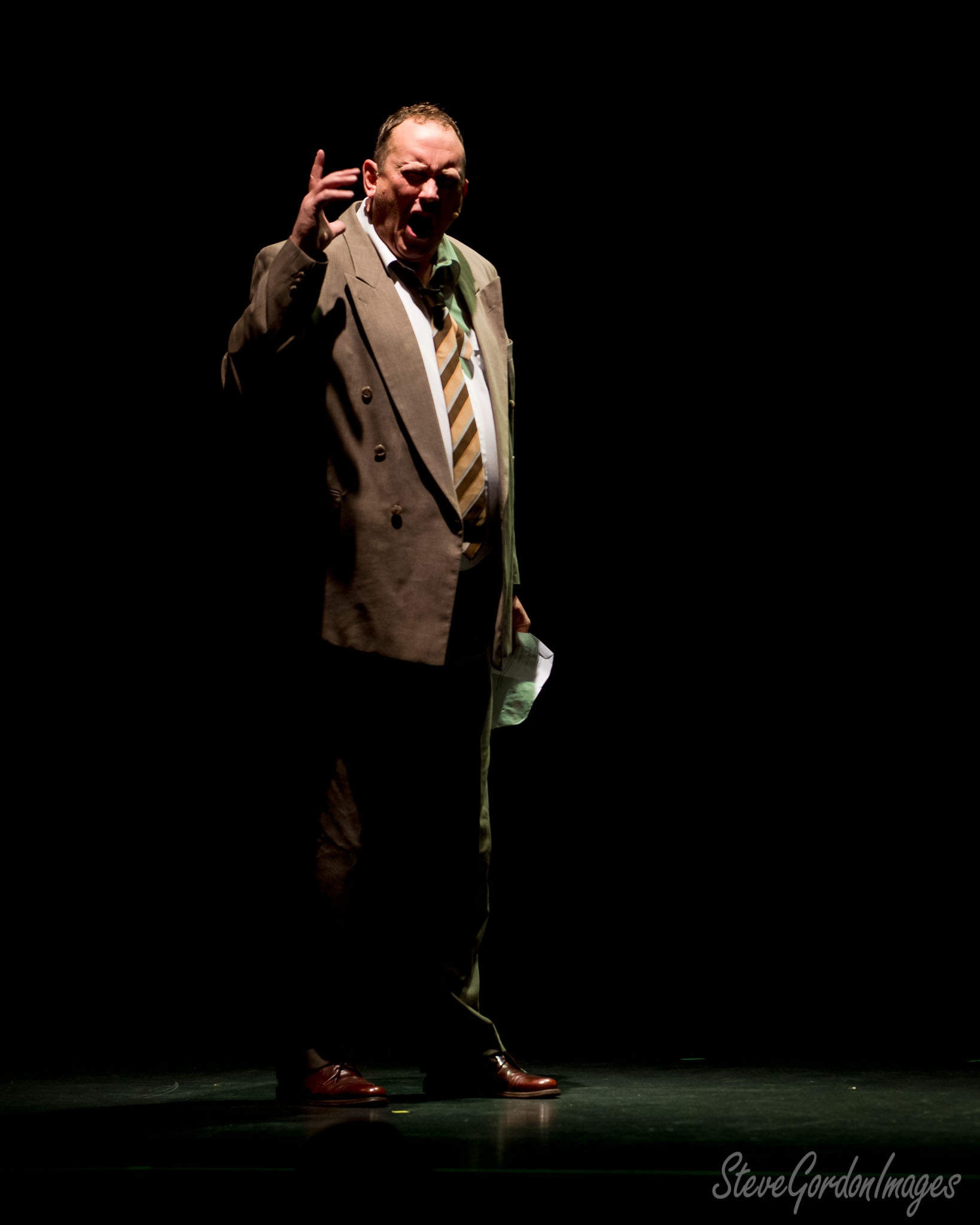GalleriesArtsTheatre15 Ladies In BlackPerformancesActor's Dramatic Performance, Stage Lighting. A man in a suit, holding paper, shouts on stage. He is performing, a play. Actor's Dramatic Performance, Stage Lighting.