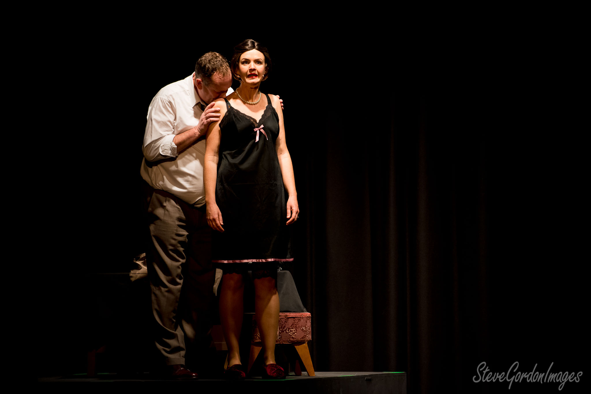 GalleriesArtsTheatre15 Ladies In BlackPerformancesStage Drama, Black Dress, Intimate. On stage, a man kisses a woman's neck. She wears a black dress with a pink bow. Stage Drama, Black Dress, Intimate.