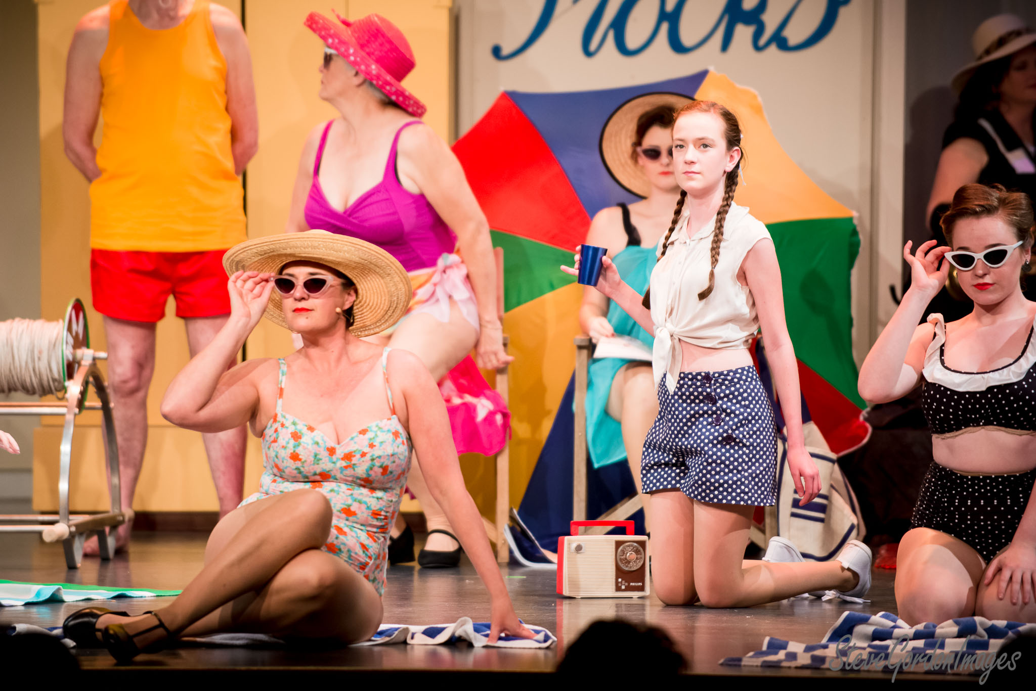 GalleriesArtsTheatre15 Ladies In BlackPerformancesBeach Scene, Vintage Play, Summer. A beach scene: Actors in swimwear perform on stage. A Philips radio sits near a woman in polka dots. Beach Scene, Vintage Play, Summer.