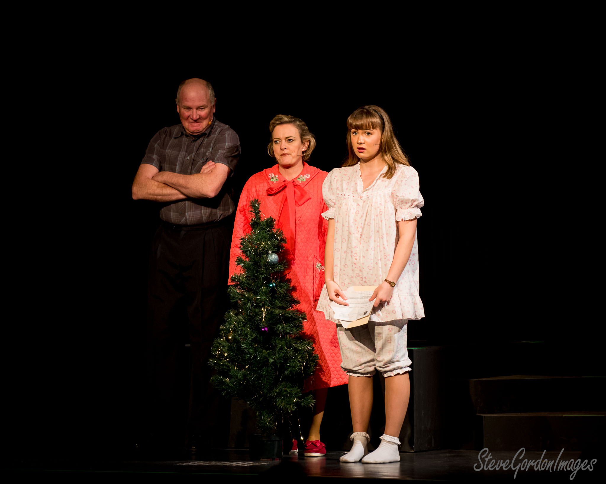 GalleriesArtsTheatre15 Ladies In BlackPerformancesStage Play Christmas Tree Scene. Three actors on stage, a small Christmas tree, a script, and a red robe. They are performing. Stage Play Christmas Tree Scene.