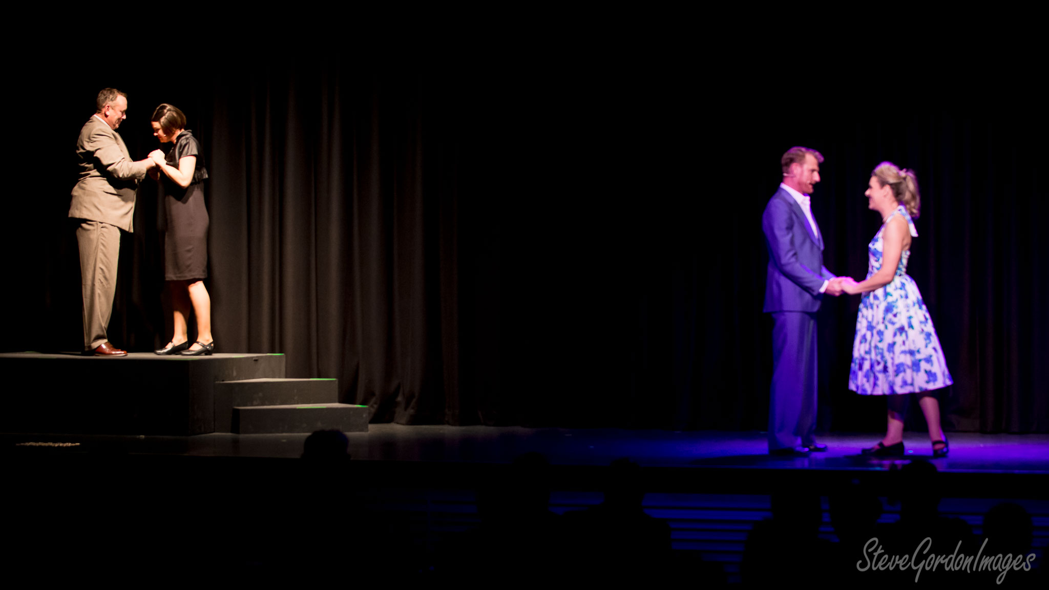 GalleriesArtsTheatre15 Ladies In BlackPerformancesStage Play, Actors, Holding Hands. Two couples, on stage, hold hands. The play's actors perform a scene for the audience. The stage is dark. Stage Play, Actors, Holding Hands.