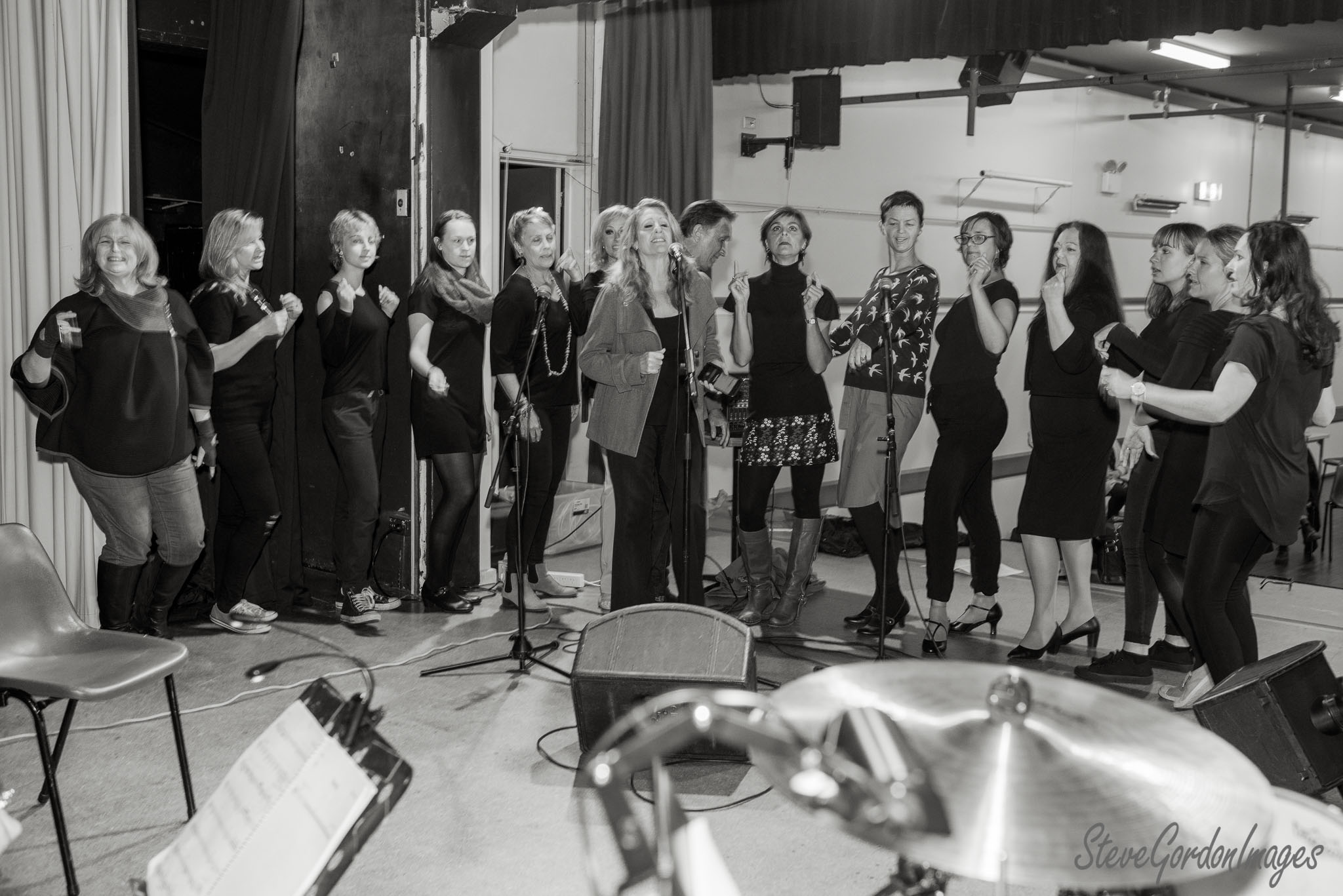 GalleriesArtsTheatre15 Ladies In BlackRehearsalsChoir Rehearsal, Black And White. A choir of women, with microphones, perform on stage. They sing, for an audience. Choir Rehearsal, Black And White.