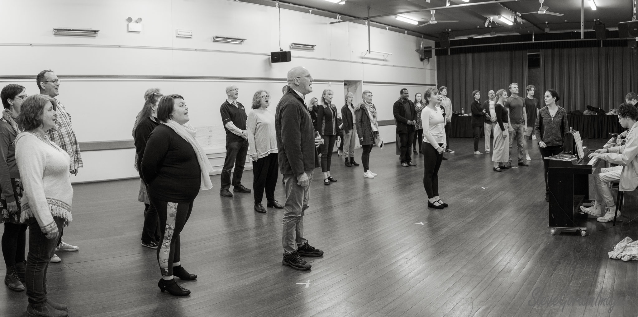 GalleriesArtsTheatre15 Ladies In BlackRehearsalsChoir Rehearsal, Black And White. A choir rehearses, led by a pianist, in a large room. Singers stand on marked spots, singing. Choir Rehearsal, Black And White.
