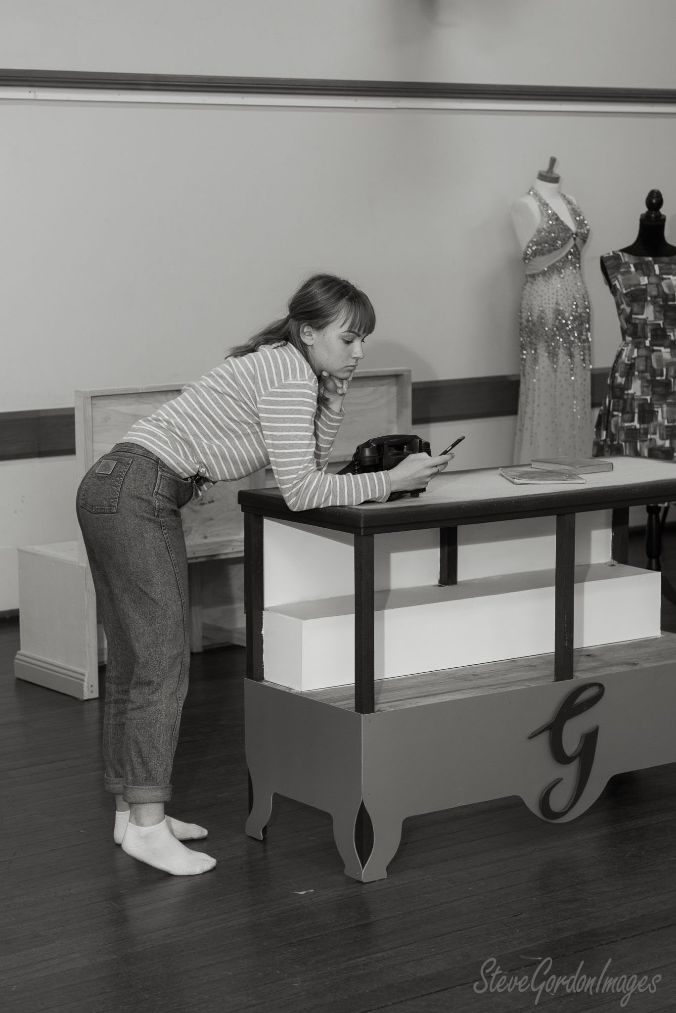 GalleriesArtsTheatre15 Ladies In BlackRehearsalsVintage Phone And Modern Technology. A woman, striped shirt, jeans, leans on a desk, holding a phone, near a "G" and dresses. Vintage Phone And Modern Technology.