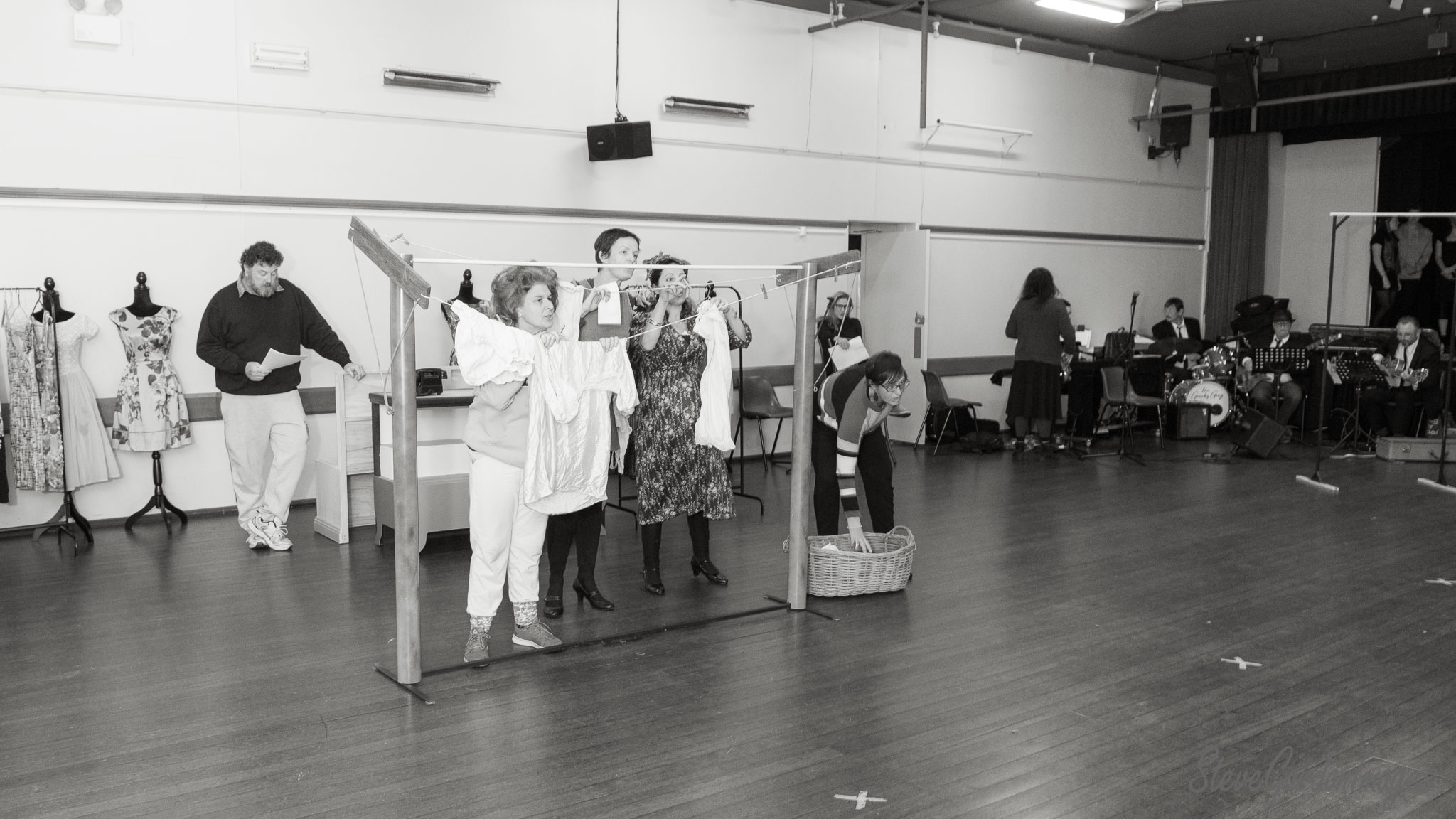 GalleriesArtsTheatre15 Ladies In BlackRehearsalsLaundry Day, Stage, Band, Dresses. Actors hang laundry on a clothesline as a man reads a script. A band, "The Crooks Crew," plays. Laundry Day, Stage, Band, Dresses.