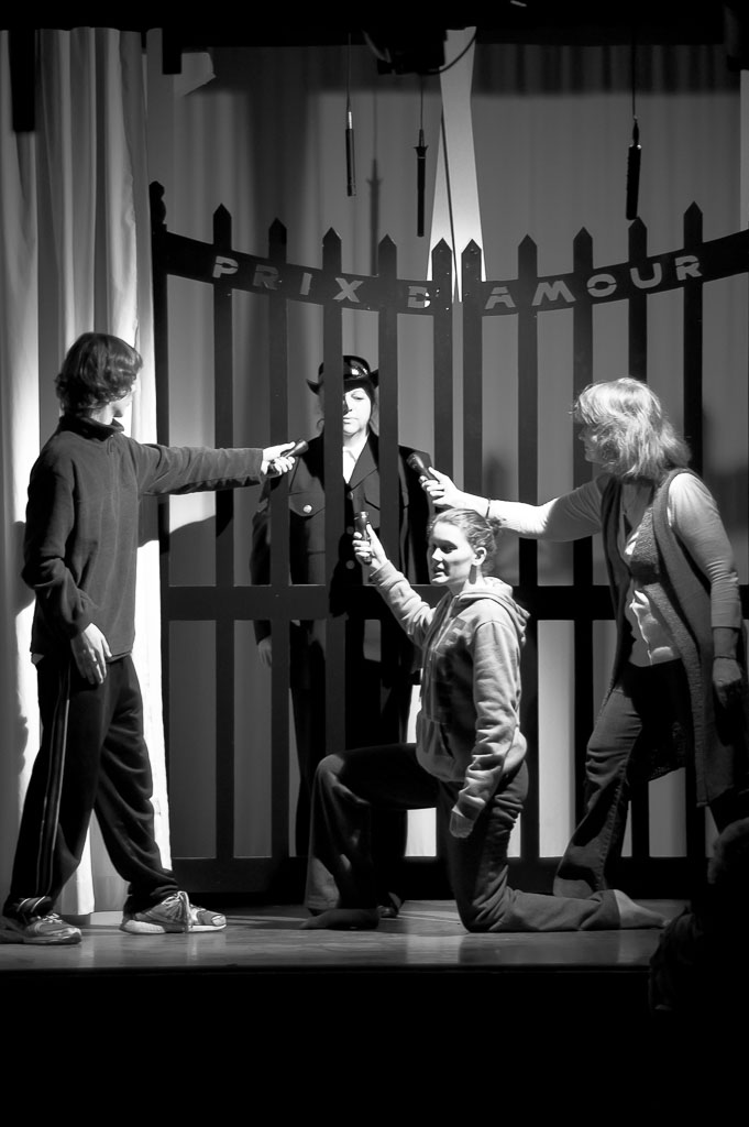 GalleriesArtsTheatre2 Prix D AmourRehearsalsPrix D'Amour Stage Play Scene. Prix D'Amour Stage Play Scene. Actors perform a play, "Prix D'Amour," with microphones, a gate, and a person in a police uniform. Prix D'Amour Stage Play Scene.