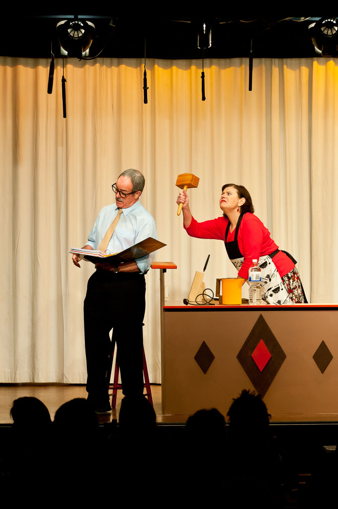 GalleriesArtsTheatre3 4 Lady DirectorsPerformancesStage Drama, Mallet, Book, Angry Woman Stage Drama, Mallet, Book, Angry Woman On stage, a woman with a mallet confronts a man with papers, during a play. Stage Drama, Mallet, Book, Angry Woman
