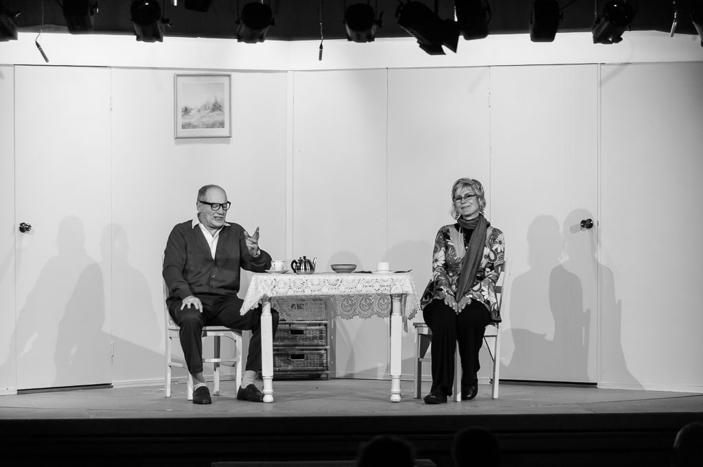 GalleriesArtsTheatre4 Travelling NorthRehearsalsStage Play, Two Actors Seated. Stage Play, Two Actors Seated. Two actors sit at a table on stage. The man gestures, the woman smiles. A play is in progress. Stage Play, Two Actors Seated.