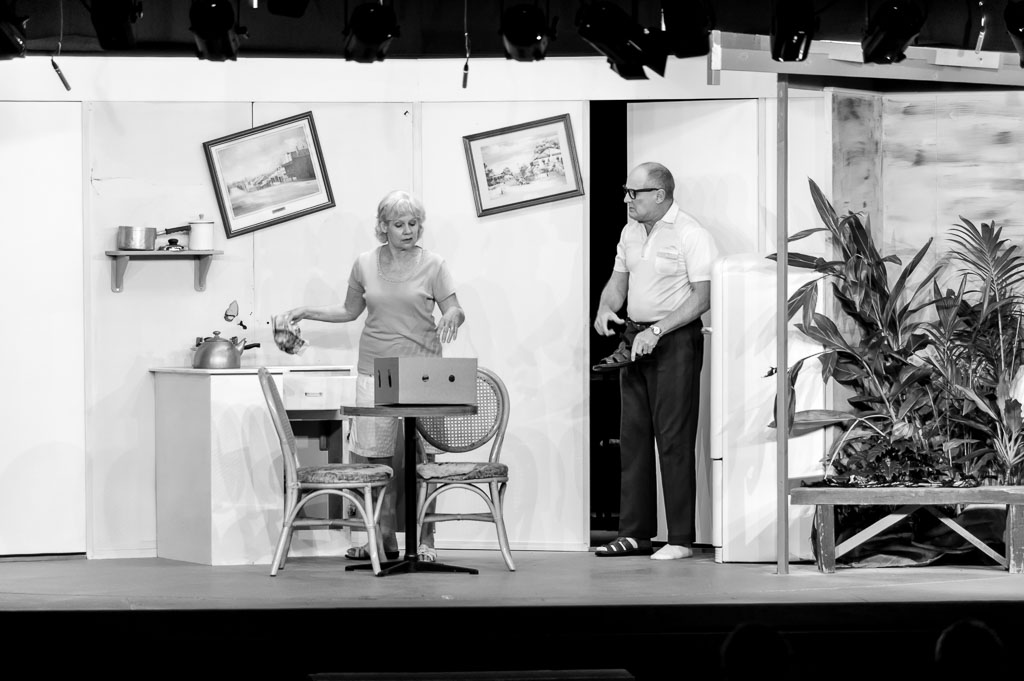 GalleriesArtsTheatre4 Travelling NorthRehearsalsStage Set, Black And White. Stage Set, Black And White. On stage, a woman and man act. The woman holds a box, the man holds shoes. A play. Stage Set, Black And White.