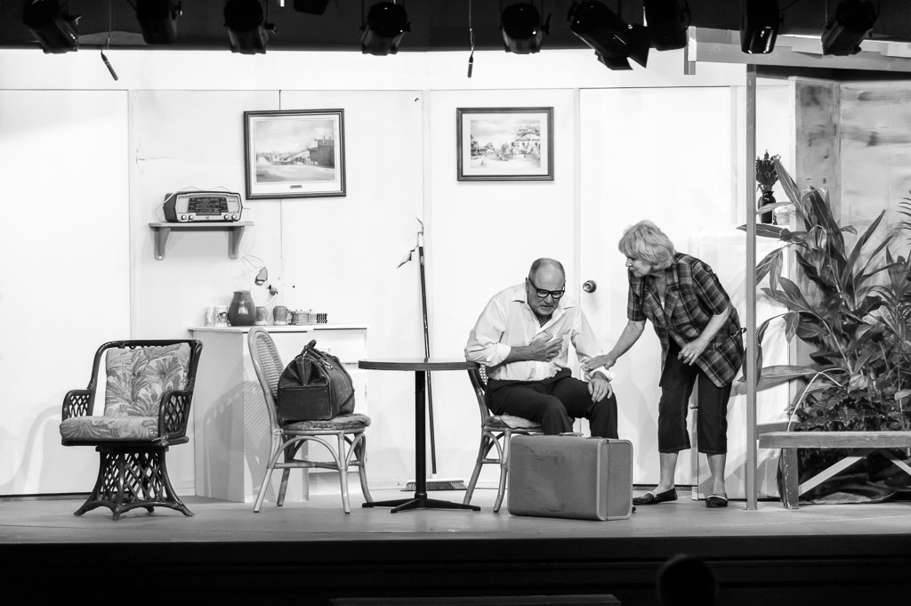 GalleriesArtsTheatre4 Travelling NorthRehearsalsStage Play, Black And White. Stage Play, Black And White. On stage, a man clutches his chest as a woman assists him. A suitcase sits nearby. Stage Play, Black And White.