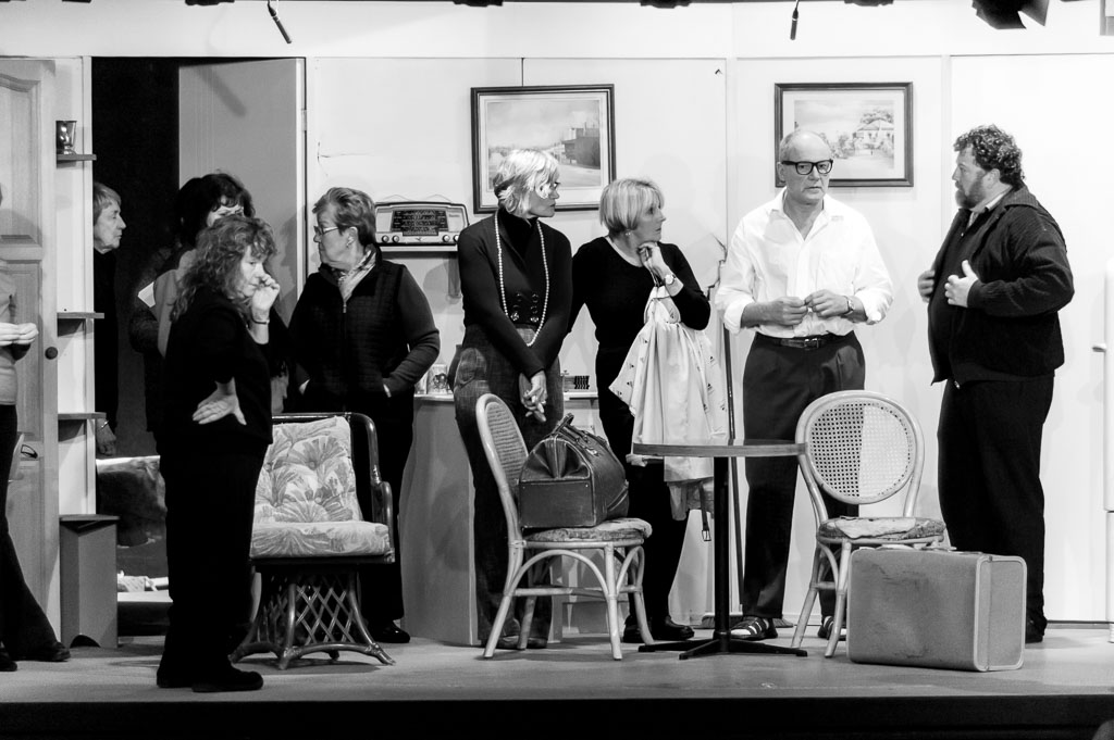 GalleriesArtsTheatre4 Travelling NorthRehearsalsStage Play, Black And White. Stage Play, Black And White. A play's cast, including a woman with a bag, stand on stage. A radio is visible. The scene is set. Stage Play, Black And White.