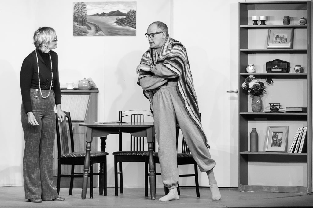 GalleriesArtsTheatre4 Travelling NorthRehearsalsStage Play, Black And White. Stage Play, Black And White. Two people, a woman and a man, are in a room. The man wears a blanket, the woman a necklace. They converse. Stage Play, Black And White.