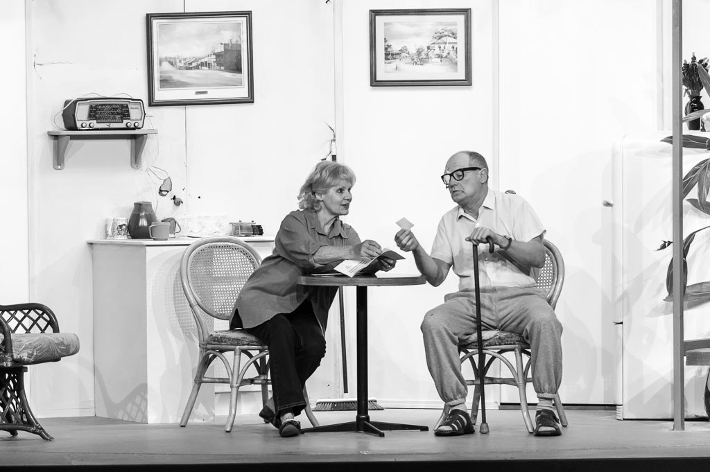 GalleriesArtsTheatre4 Travelling NorthRehearsalsCouple Discussing Cards, Vintage Scene. Couple Discussing Cards, Vintage Scene. A woman and man, seated, examine papers. The man holds a card, cane nearby. A radio sits on a shelf. Couple Discussing Cards, Vintage Scene.