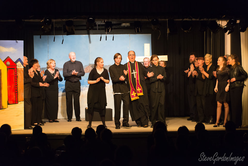 GalleriesArtsTheatre5 Dare DevilsPerformancesStage Play Cast, Applause, Curtain Call. Stage Play Cast, Applause, Curtain Call. A play's cast takes a bow. The priest, wearing a cross, stands center stage. The audience applauds. Stage Play Cast, Applause, Curtain Call.