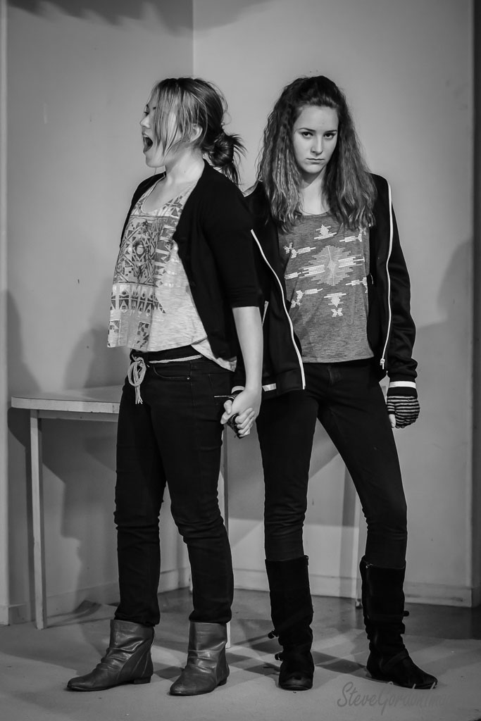 GalleriesArtsTheatre5 Dare DevilsRehearsalsScreaming, Holding Hands, Black And White. Screaming, Holding Hands, Black And White. Two young women hold hands, one screams, the other stares. They wear black jackets, jeans, and boots. Screaming, Holding Hands, Black And White.