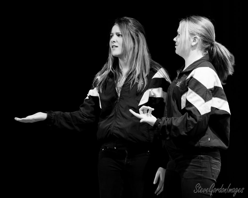 GalleriesArtsTheatre5 Dare DevilsRehearsalsTwo Women, Black Jackets, Gesturing. Two Women, Black Jackets, Gesturing. Two young women, wearing jackets, perform on stage. One gestures, the other watches. They are in a play. Two Women, Black Jackets, Gesturing.