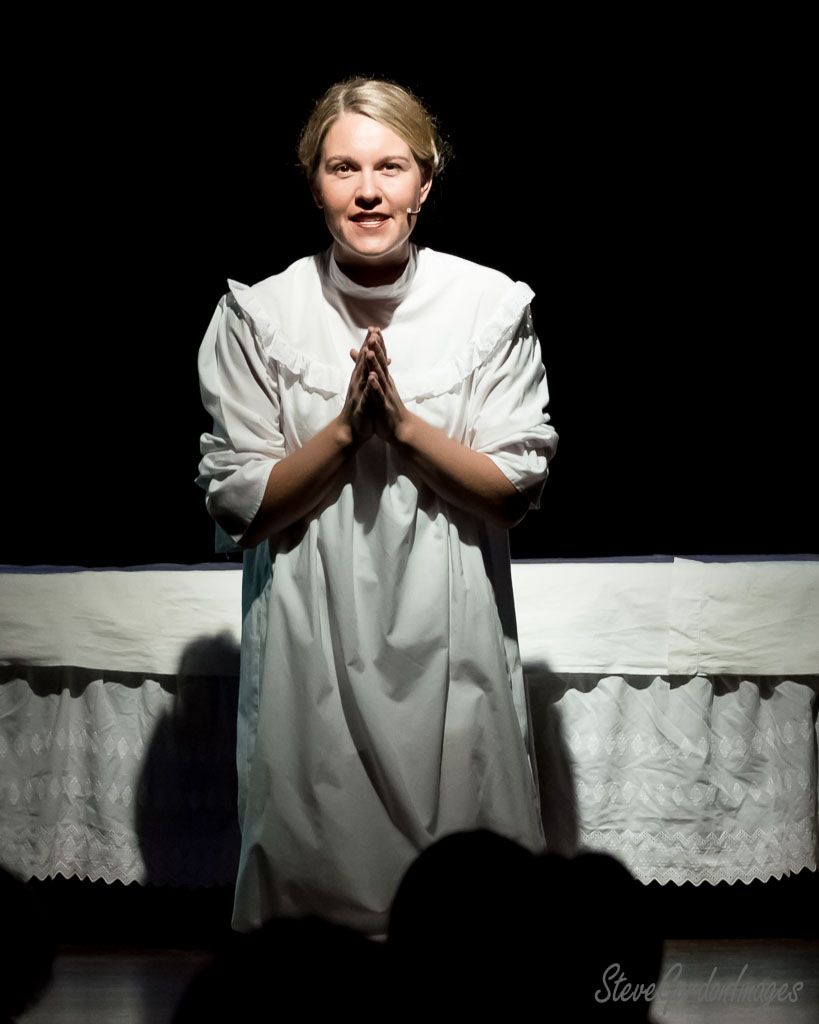 GalleriesArtsTheatre6 Sound of MusicPerformancesWoman In White, Stage Performance. Woman In White, Stage Performance. A woman in a white dress, hands clasped, smiles on stage. She is performing in a play. Woman In White, Stage Performance.