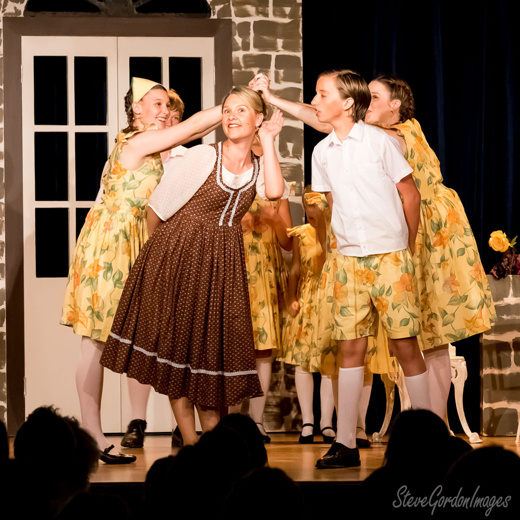 GalleriesArtsTheatre6 Sound of MusicPerformancesStage Play, Costumes, And Audience. Stage Play, Costumes, And Audience. A stage performance: A woman in a brown dress is being playfully teased by others in yellow dresses. Stage Play, Costumes, And Audience.