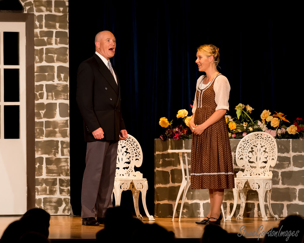 GalleriesArtsTheatre6 Sound of MusicPerformancesStage Play, Actors, Floral Backdrop, Chairs. Stage Play, Actors, Floral Backdrop, Chairs. On stage, a man and woman perform. The man wears a suit, the woman a dress. They are acting. Stage Play, Actors, Floral Backdrop, Chairs.