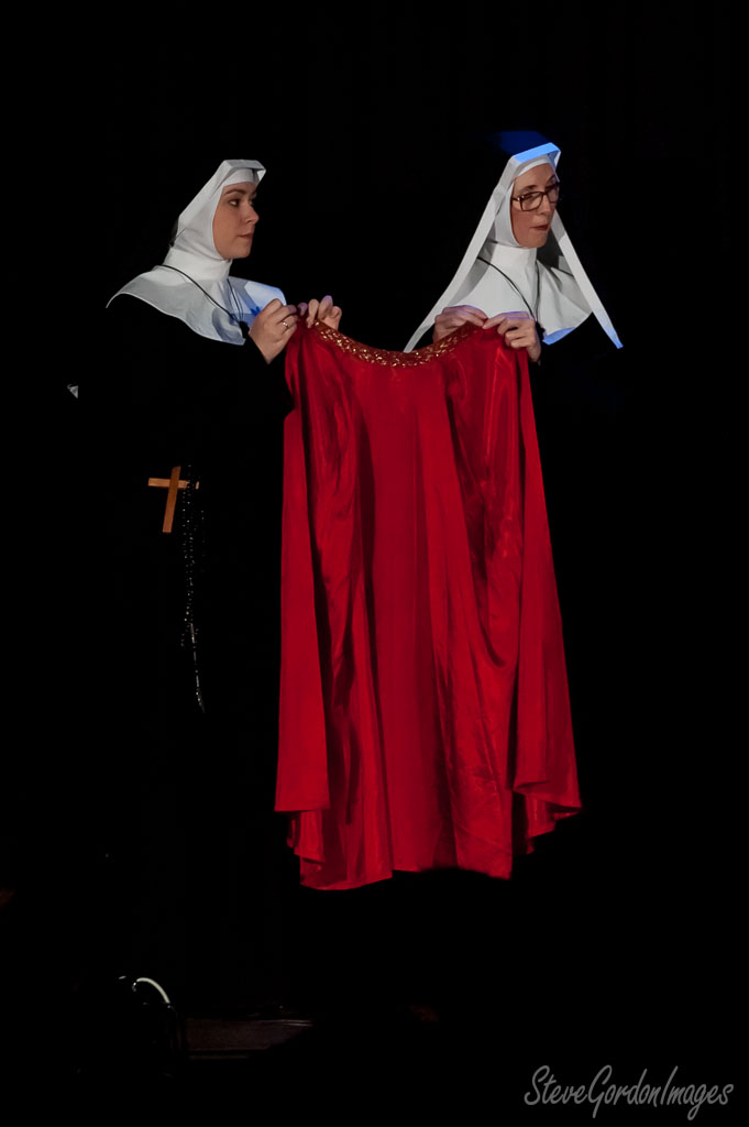 GalleriesArtsTheatre6 Sound of MusicPerformancesNuns Displaying Red Velvet Drape. Nuns Displaying Red Velvet Drape. Two nuns hold a red garment with gold trim. One wears glasses, a cross is visible. Nuns Displaying Red Velvet Drape.