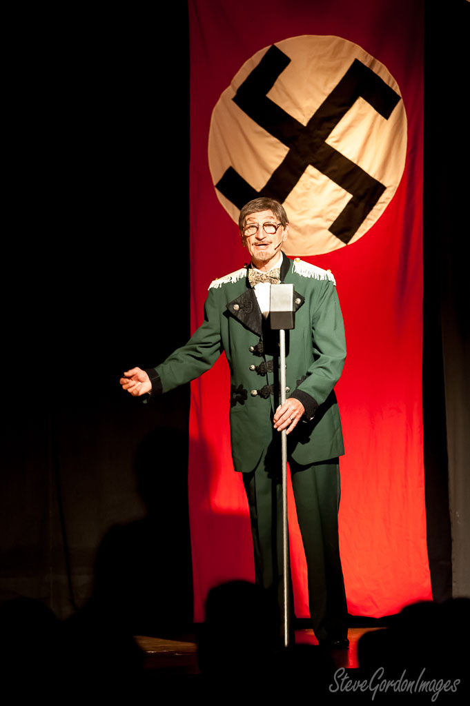 GalleriesArtsTheatre6 Sound of MusicPerformancesMan In Green, Swastika Backdrop. Man In Green, Swastika Backdrop. A man in a green uniform stands before a Nazi flag, speaking into a microphone. He is on stage. Man In Green, Swastika Backdrop.